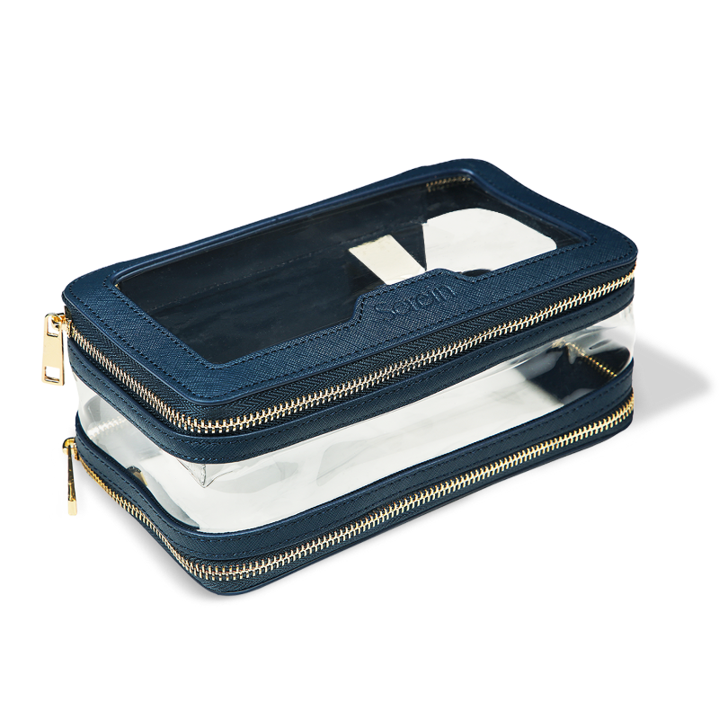Crafted with Vegan leather panels, elegant gold-plated hardware, and biodegradable TPU, this bag blends clarity with class. The wipeable, transparent front and back make it easy to see and grab exactly what you need — wherever life takes you.